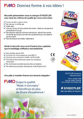 Toutes les pâtes à modeler thermodurcissantes FIMO sont conformes à la normes européennes EN 71-5 sur la sécurité des jouets ».